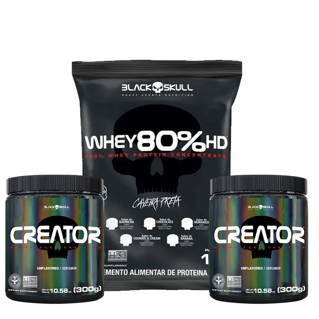 Potencialize seus resultados com a combinação poderosa do Whey Protein 80% HD e da Creatina Creator Caveira Preta!