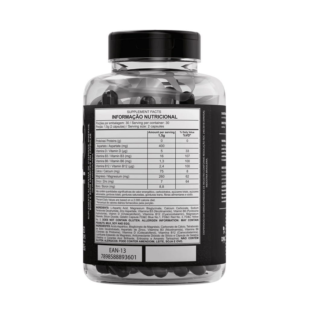 Suporte hormonal completo com zinco, magnésio e vitaminas do complexo B, que estimulam a produção natural de testosterona e GH. Ideal para quem busca mais força, resistência, disposição e desenvolvimento muscular contínuo.